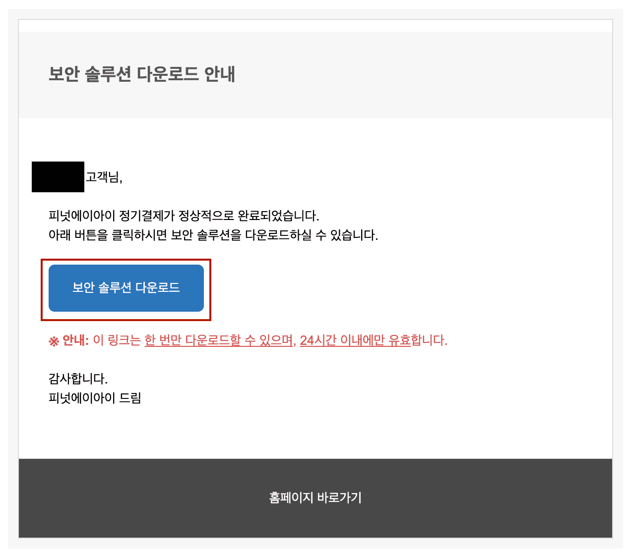 *에이전트 다운로드 링크는 일회성이며 메일 수신 후 24시간이 지나면 다운로드 불가