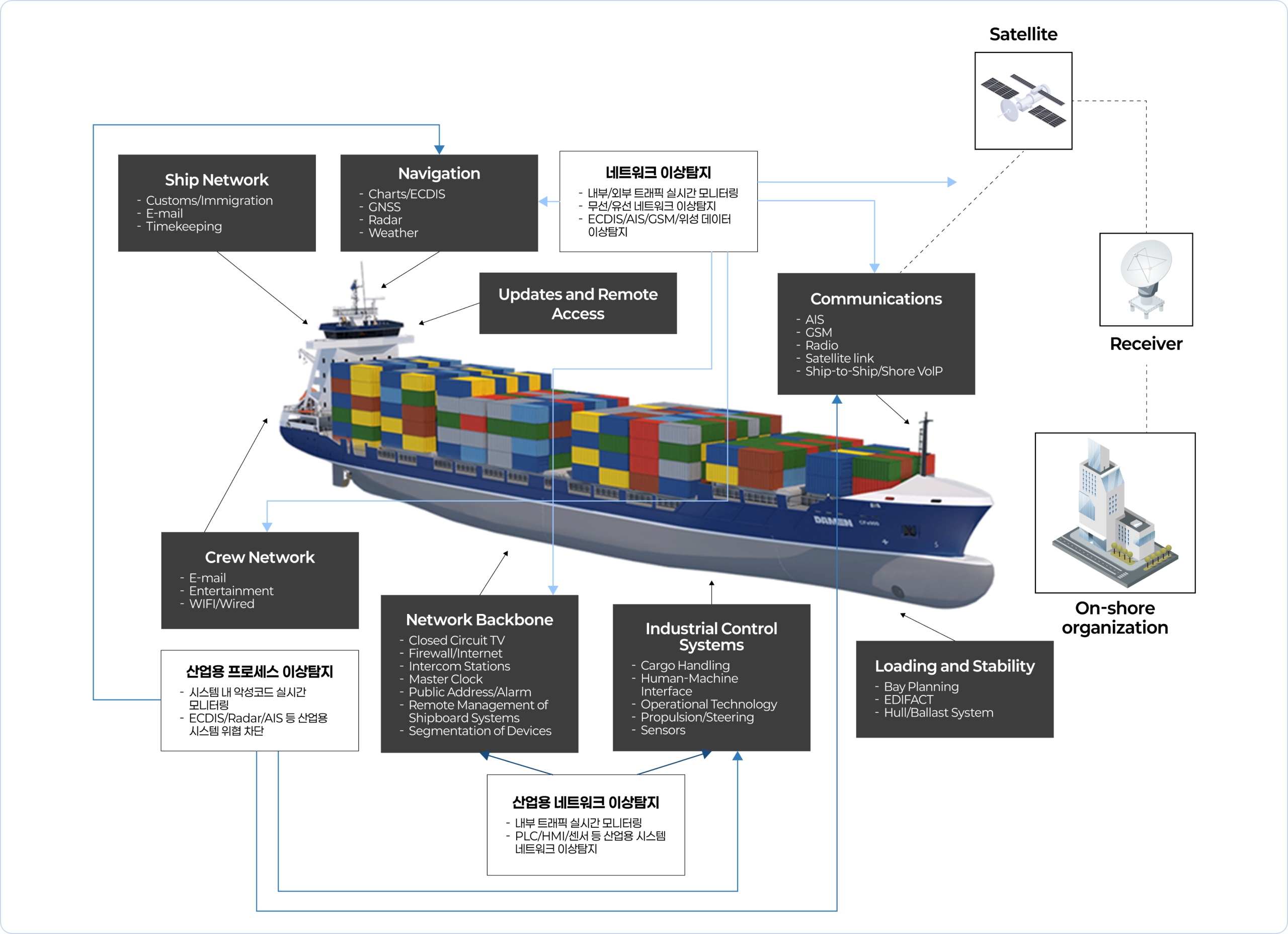 - 스마트 선박 및 자동화 시스템 : 항법, 엔진 관리, 화물 추적 등의 선박 운영 시스템이 디지털화되면서 사이버 위협에 노출.