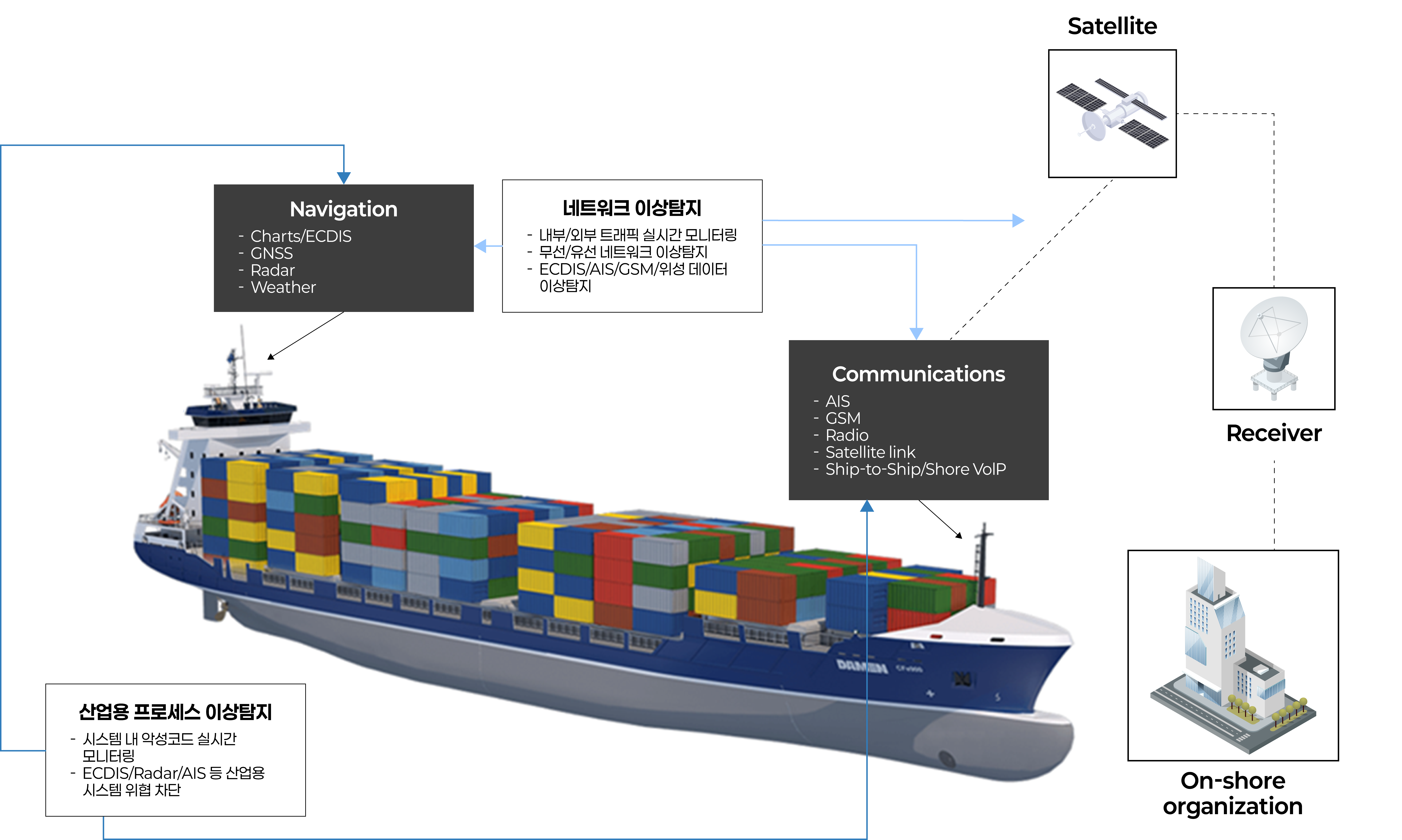 - 항해 중단 방지 : 해커가 항법 시스템(GPS, ECDIS 등)을 공격하거나 조작할 경우 선박 안전에 위협. 이는 충돌, 좌초, 항로 변경과 같은 위험을 초래